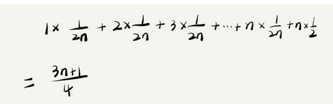 这个结论是正确的,但是计算过程稍微有点儿问题。问题是什么呢?我们刚讲的这n+1中情况,出现的概率是不一样的。我们知道,我们要查找的元素x,有在数组中和不在数组中两种情况。这两种情况对应的概率都为1/2,另外0~n-1中出现x的概率是一样的,都为1/n,所以,要查找的数据出现在0~n-1中任意位置的概率为1/(2n)。因此,考虑进了发生概率之后,平均时间复杂度的甲酸过程就变成了下图: