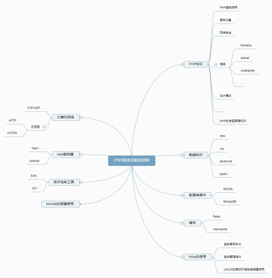 对于这个图,我还是得说不是完整的,因为我还没有加入数据结构的知识,看个人工作需要可以拓展的自学,反而是你学完这些东西找到一份工作或者说去开发PHP相关工作是肯定没问题的!但是我不希望你止步于学完他们就停下了。