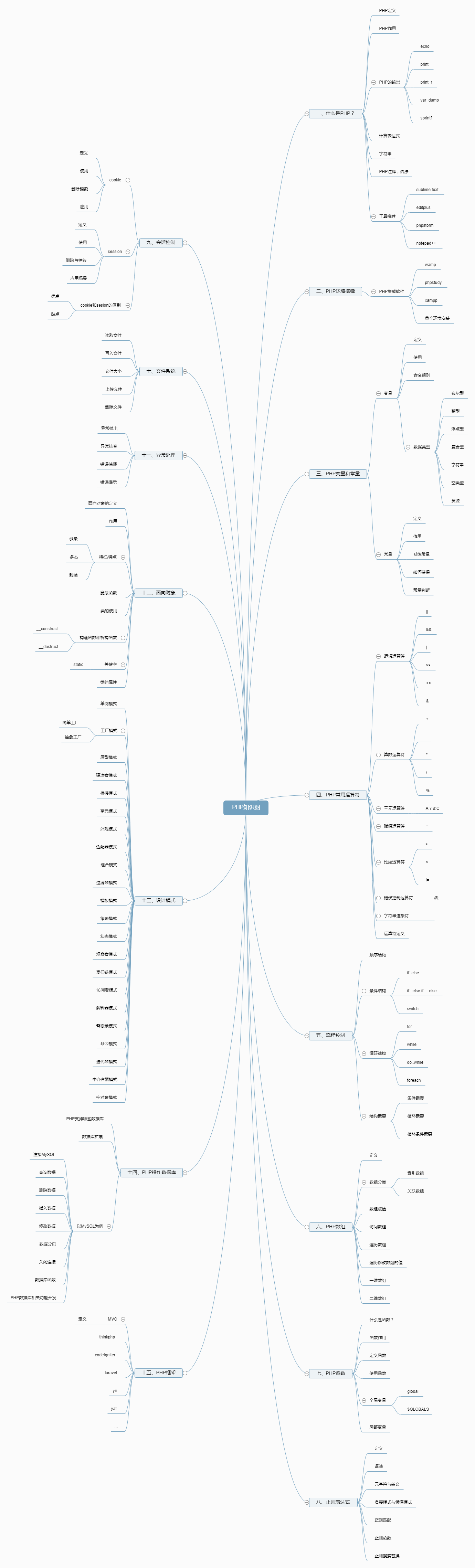 你正在学PHP,我特意总结了从小白到老手的整个知识结构导图,这个导图比较简单,每个模块拓展开来都是一个很大模块的内容,由于时间的原因,我只总结了PHP的。后续会补上!