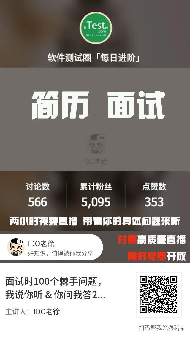 我是IDO老徐,isTester,十年测试职业老鸟,某公司质量部Leader,持续输出原创职业观点、经验、答疑解惑。希望通过自己的文字改变测试职业现状,让测试从业者整体水平提升一个Level 。