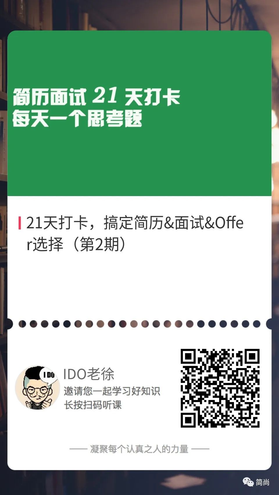 2、老徐把「简历&面试&选Offer」,拆成了21个常见问题,每天老徐问大家一个问题,每天打卡;21天打卡,掌握这个系列;