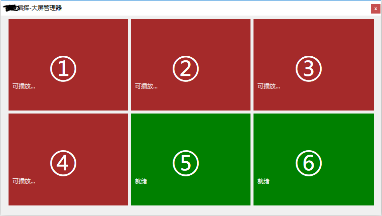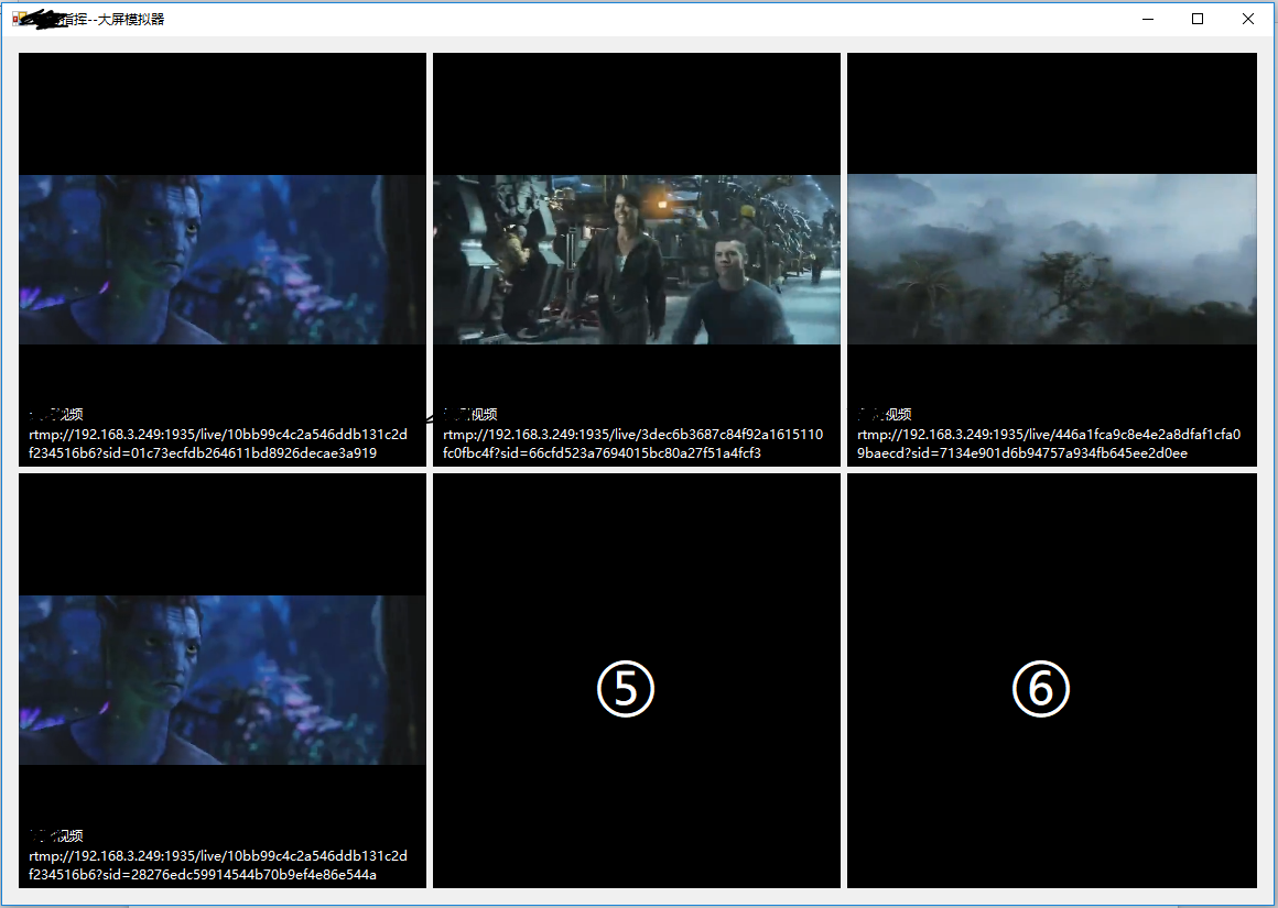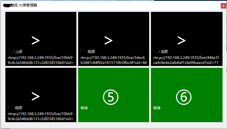 选择摄像头,将摄像头实时流推到大屏上。流程为:请求大屏上墙(携带大屏ID)->计算rtmp->推流开始->拉流开始。下图为大屏模拟管理器: