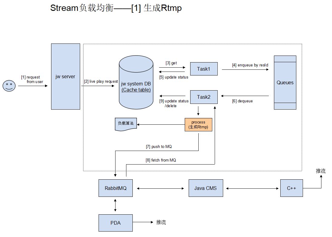 该模块属于java 后台的一部分,当然也可以分开部署,它与web后台是通过数据库中的请求表同步数据。接下来是负载均衡中生成rtmp的逻辑,rtmp也就是本文开头提到的推流\拉流地址了。