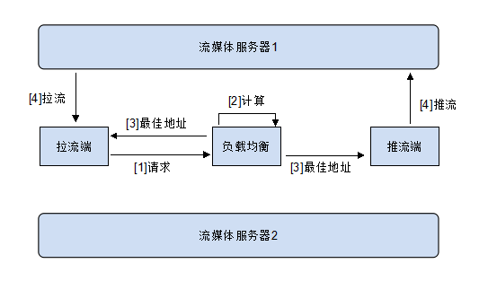 如上图,存在多个流媒体服务器时,负载均衡需要根据指定的策略计算出最佳的服务器地址,然后推流端和播放端根据地址分别推流拉流。图中由计算得出,使用流媒体服务器1。