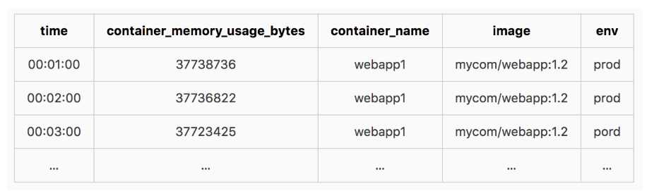 只需要定义一个全局的指标 container_memory_usage_bytes,然后通过添加不同的维度数据来满足不同的业务需求