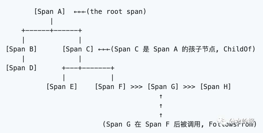 - References,Span间关系,目前定义了两种关系:ChildOf(父子,父级span某种程度上取决于子span) 和 FollowsFrom(跟随,父级节点不以任何方式依然他们子节点的执行结果)