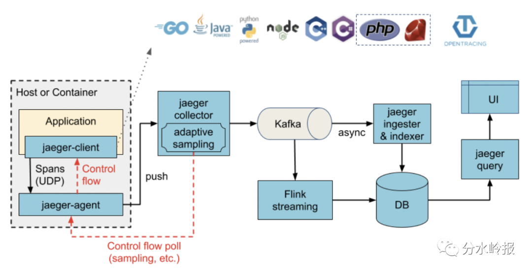 - jaeger-client:Jaeger的客户端,实现了OpenTracing的API,支持主流编程语言。客户端直接集成在应用程序中,把trace信息按指定的采样策略传递给jaeger-agent,这个过程通常被称为埋点。