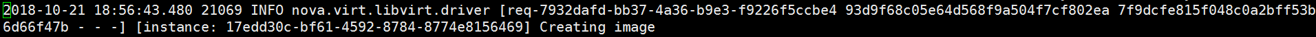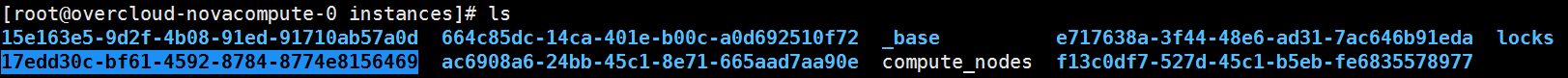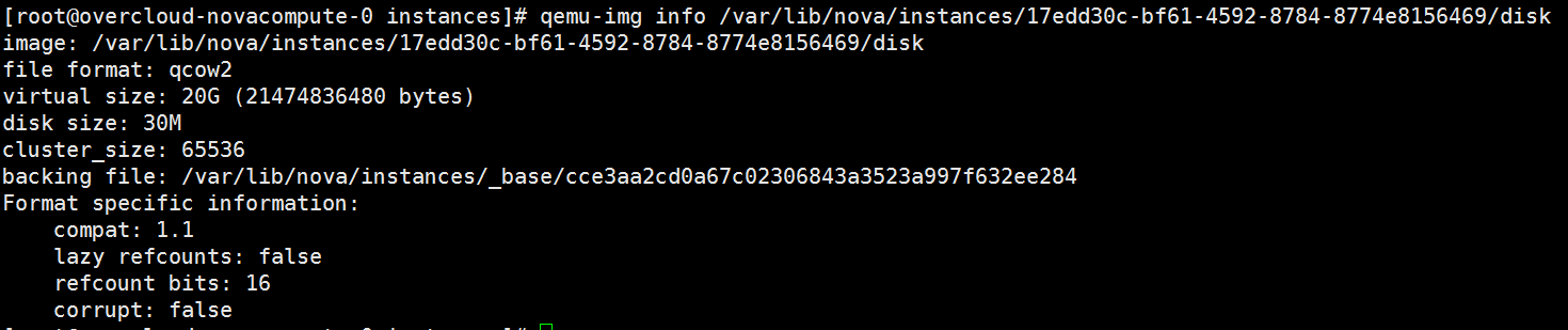 instance 的镜像为 qcow2 格式,因此还需将 raw 格式的 image 转换为 qcow2 的 image 给 instance 用,转换后的 image 在 /var/lib/nova/instances 目录下,uuid 为 17edd30c-bf61-4592-8784-8774e8156469,该uuid 即为 instance 的 uuid 。