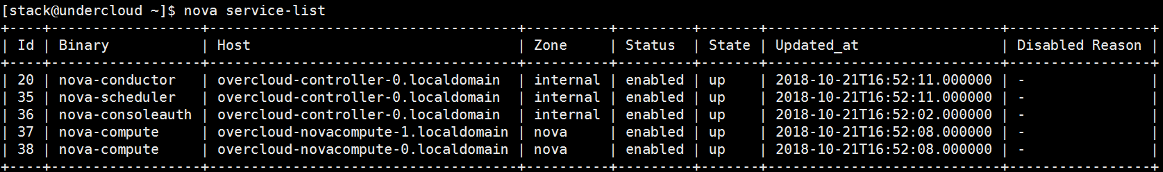 命令 nova service-list 显示 nova 服务运行在哪个节点上: