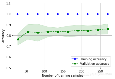 (1)验证精确度约为0.85,对于给定数据集的大小,这个结果是非常不错的。(2)这个模型过度拟合,在训练曲线和验证曲线之间有很大的差距。