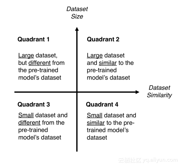 象限3.小数据集,不同于预训练模型的数据集,这里唯一适合的就是策略2。很难在训练和冻结的层数之间平衡。如果你涉及的太深入,那么模型就会过度拟合;如果你仅停留在模型的表面,那么你就不会学到任何有用的东西。也许,你需要比象限2更深入,并且需要考虑数据增强技术。