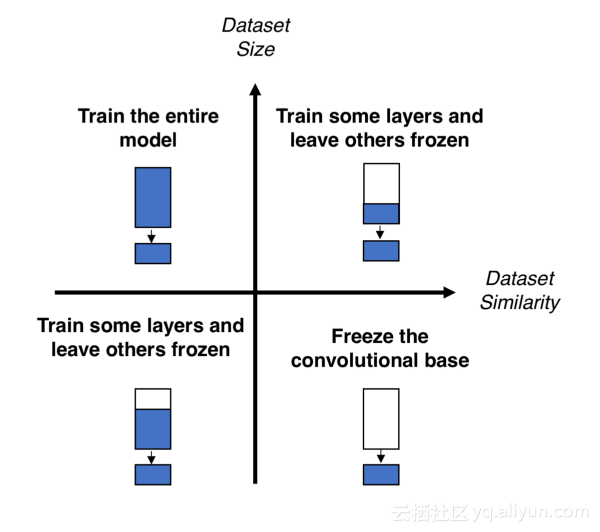 象限2.大数据集与类似于预训练模型的数据集。在这里任何选项都有效,可能最有效的是策略2。由于我们有一个大数据集,过度拟合不应该是个问题,所以我们可以尽可能多地学习。然而,由于数据集是相似的,我们可以通过利用以前的知识来节省大量的训练工作。因此,仅对卷积基的分类器和顶层进行训练就足够了。