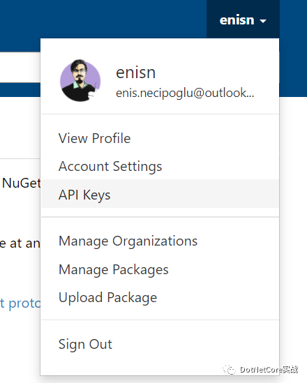 首先,您需要一个Api-Key与nuget API通信。转到nuget.org上的个人资料,然后找到“ API密钥”部分,如下所示。