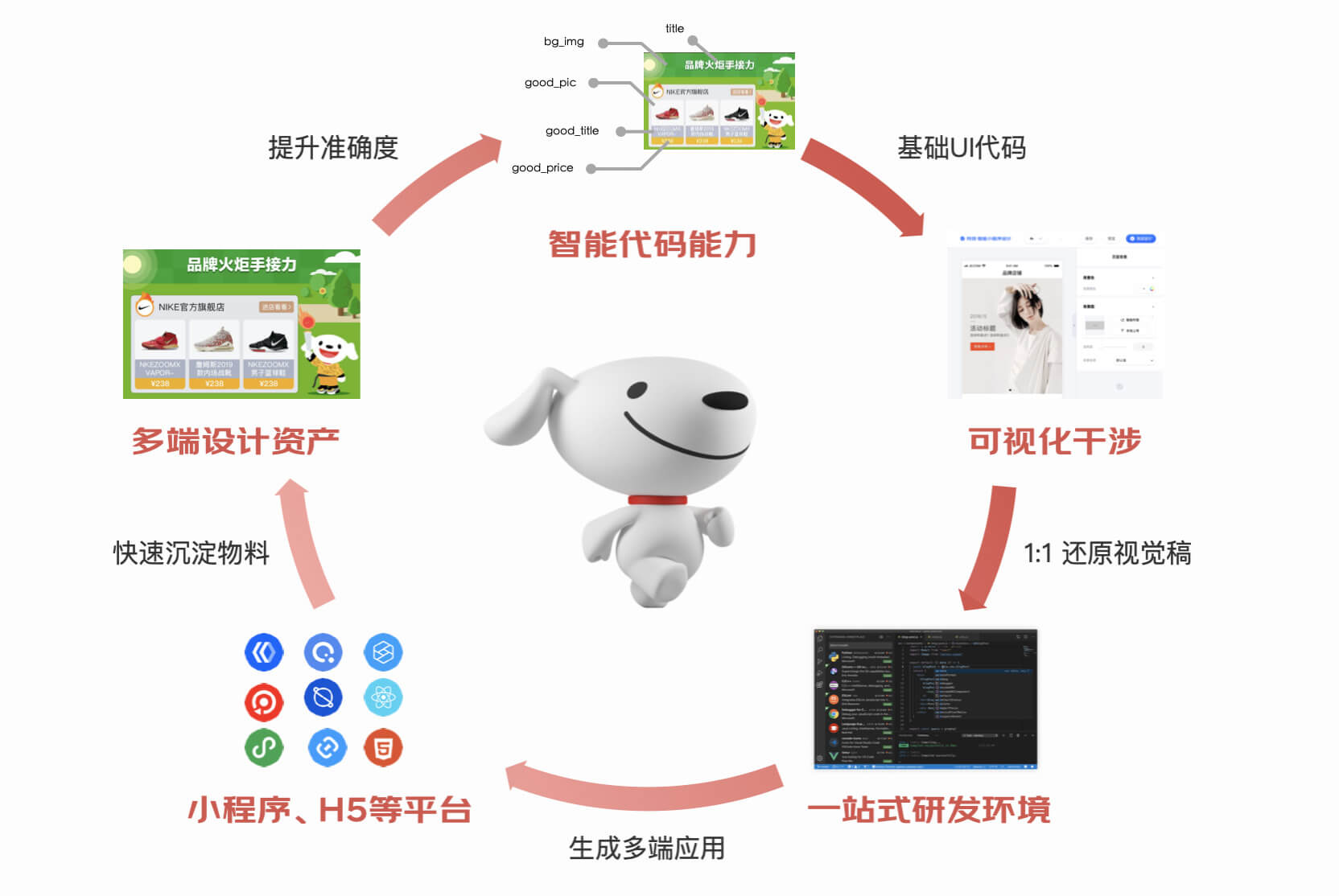 目前我们现有的产研流程,首先设计稿通过智能代码能力一键生成可二次开发的代码,代码导入 Cloud IDE 中进行开发调整,最后可以通过 Taro 生成多端应用,这是一个线性的过程,而同时,在此过程中也能快速沉淀设计研发资产,设计研发资产也能作为智能代码智能识别的样本数据,沉淀设计资产又可以提供给可视化搭建平台,直接搭建出多端应用,同时羚珑智能设计将为应用提供个性化的图片和视频,丰富应用的运营能力。由此,实现了一个良性的产研闭环。