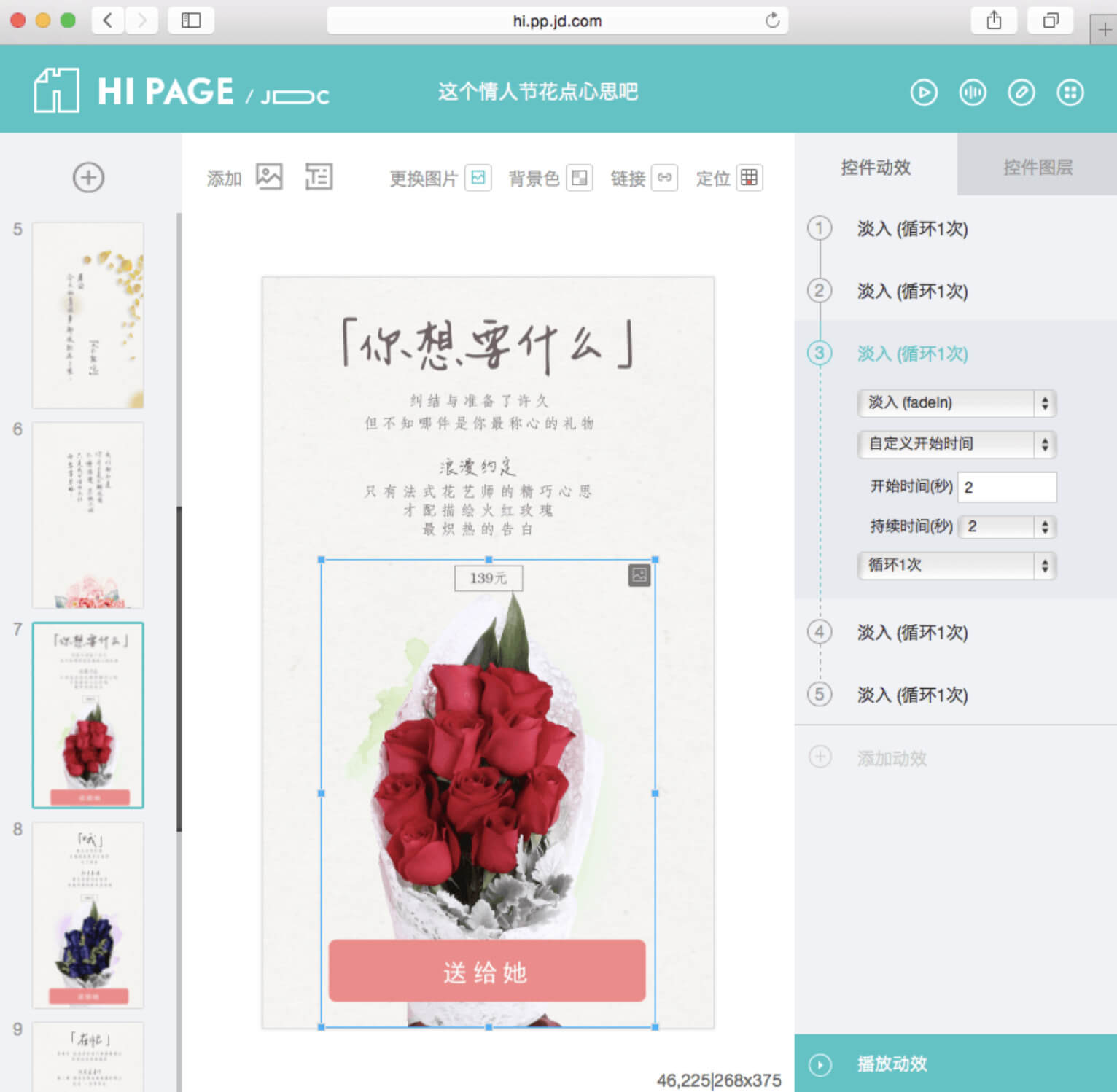 同时,在沉淀了大量精品的 H5 业务之后,我们也开始尝试打造一个可视化搭建工具 HiPage,通过拖拽搭建的方式就能将沉淀的 H5 动画元素组合出新的 H5 页面,实现快速上线,得到业务方的一阵惊叹。这是我们第一个颇具意义的技术产品,它既服务好了业务方,也满足了我们作为技术人员对技术的追求,同时也为我们埋下了关于团队方向思考的引子。