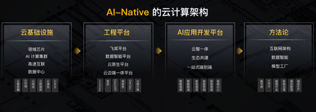 全新的AI-Native架构主要由三部分组成,一是数据中心、AI芯片、AI计算集群、高速互联网等组成的云基础平台层;二是飞桨平台、数据智能平台、云原生平台、云边端一体平台提供全栈技术的工程开发平台,和视频云、区块链、智能客服、智能营销、智能办公等场景应用解决方案组成的应用开发平台;三是包含互联网架构、数据智能、模型工厂的智能化实践方法论。