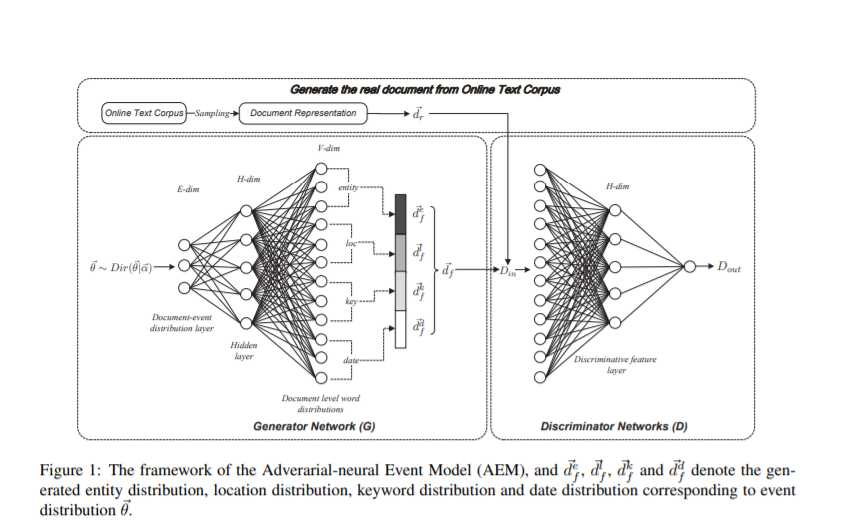 AEM使用Dirichlet先验对事件建模,并使用生成器网络来捕获潜在事件的模式,鉴别器用于区分原始文档和从潜在事件中重建的文档,鉴别器网络生成的特征允许事件抽取的可视化。