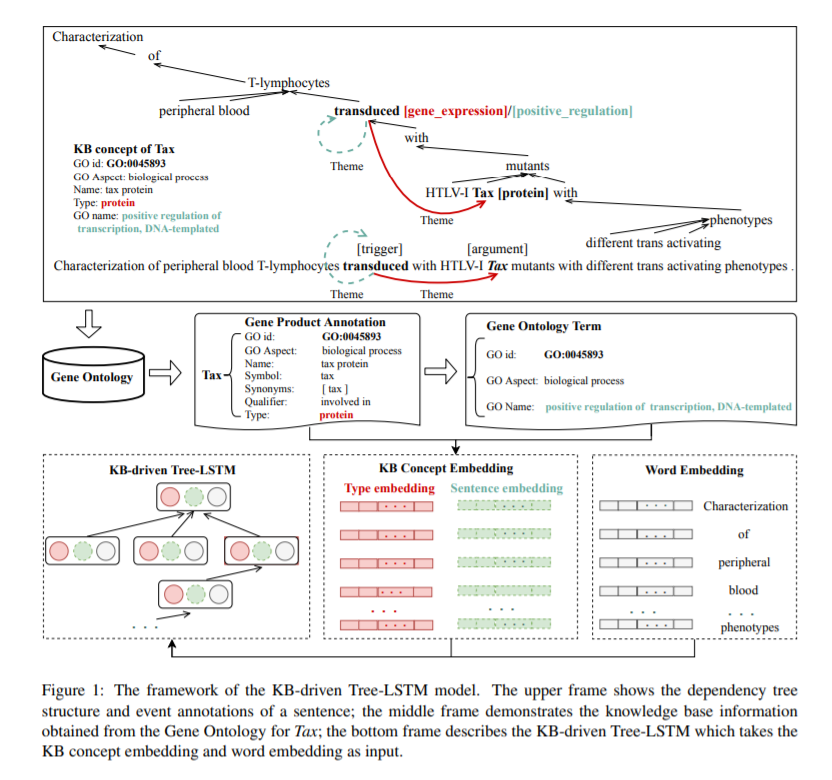 生物医学领域的事件抽取比一般新闻领域的事件抽取更具挑战性,因为它需要更广泛地获取领域特定的知识并加深对复杂情境的理解。为了更好地对上下文信息和外部背景知识进行编码,我们提出了一种新颖的知识库(KB)驱动的树结构长短期记忆网络(Tree-LSTM)框架。