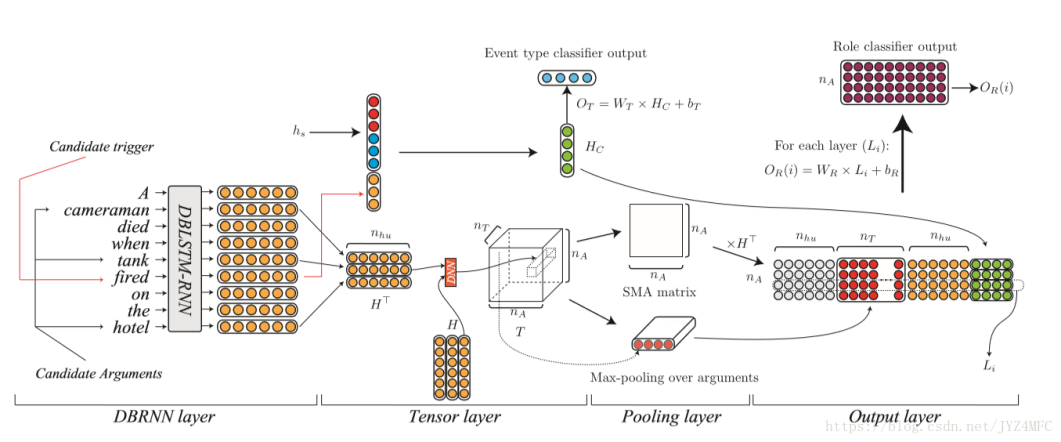 传统的事件抽取很大程度上依赖词汇和句法特征,需要大量的人工工程,并且模型通用性不强。另一方面,深度神经网络可以自动学习底层特征,但是现有的网络却没有充分利用句法关系。因此本文在对每个单词建模时,使用依赖桥来增强它的信息表示。说明在RNN模型中同时应用树结构和序列结构比只使用顺序RNN具有更好的性能。另外,利用张量层来同时捕获论元之间的关系以及其在事件中的角色。实验表明,模型取得了很好地效果。