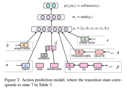 使用transition-based的框架,通过使用递增的output-building行为的state-transition过程,构建一个复杂的输出结构。在本文中我们设计了一个transition系统以解决事件抽取问题,从左至右递增地构建出结构,不使用可分的子任务结构。本文还是第一个使transition-based模型,并将之用于实体和事件的联合抽取任务的研究。模型实现了对3个子任务完全的联合解码,实现了更好的信息组合。