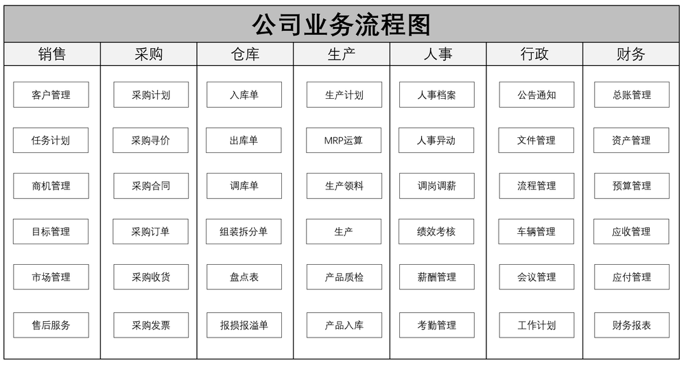 平台的软件部分就是:工作流引擎作为单据审批及业务流程穿针引线的神器;财务软件作为最终核算的集中地;进销存作为产品进、销、存流水账的汇集地;HR作为职员从入职到离职全生命周期管理的枢纽;CRM作为销售部门的武器,让销售人员披荆斩棘、所向披靡。可以见下图: