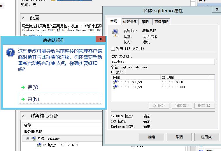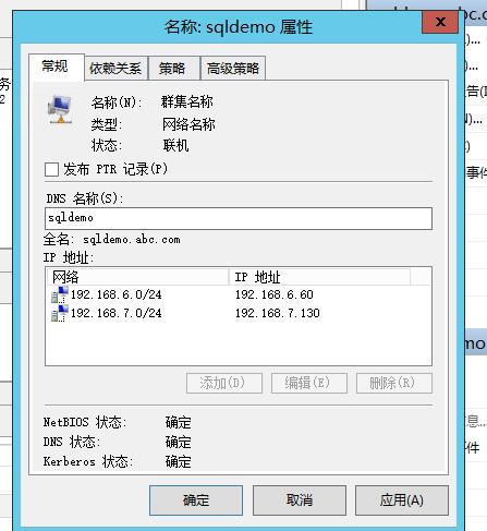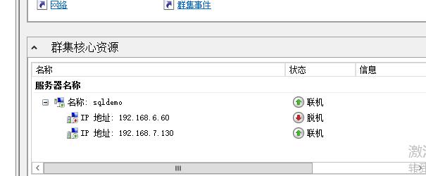 两个网段,所以会有两个侦听器IP,但是同一个时刻只有一个侦听器IP是联机状态,在WSFC集群管理器里查看