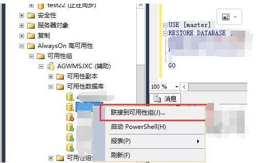 10、对数据库进行备份还原到异地节点JXCA-WMS08,在异地节点JXCA-WMS08上进行操作,将数据库逐个点击联接到可用性组