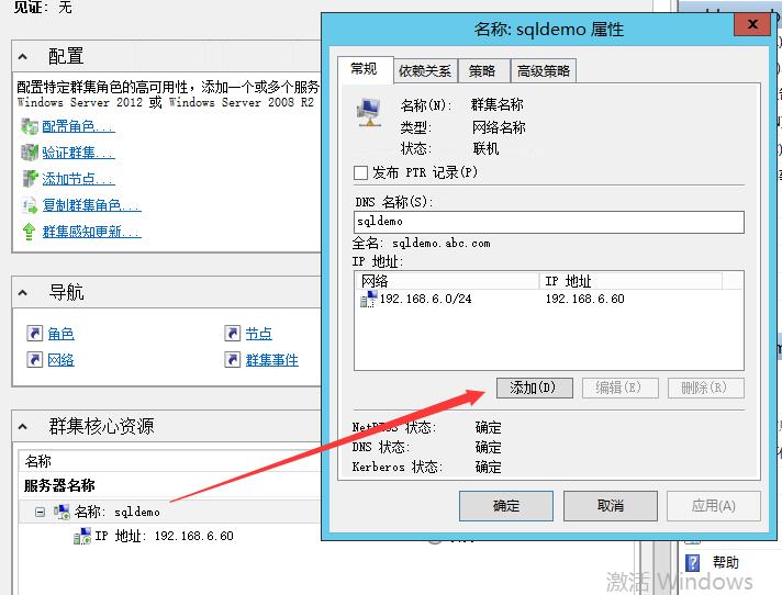 16、添加WSFC集群IP地址资源的异地机房IP,在WSFC管理器里选中群集核心资源下面的服务器名称,右键-》属性