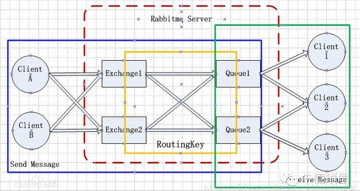 实际情况就是:生产者可能有多个,交换器可能有多个,Queue可能有多个,消费者也可能有多个,下图也只是粗略的显示了一下几个关键点。下图的那个RoutingKey其实指的是:交换器根据不同Message内的RoutingKey,交换器和不同Queue绑定的Binding key,将这两个key比较一下(要符合一定的规则),交换器就会把消息丢到目的Queue内。总之,你就当作这个图错了,这个应该是BindingKey,更好理解一些!