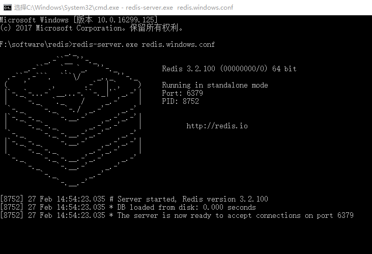 如果想方便的话,可以把 redis 的路径加到系统的环境变量里,这样就省得再输路径了,后面的那个 redis.windows.conf 可以省略,如果省略,会启用默认的。输入之后,会显示如下界面: