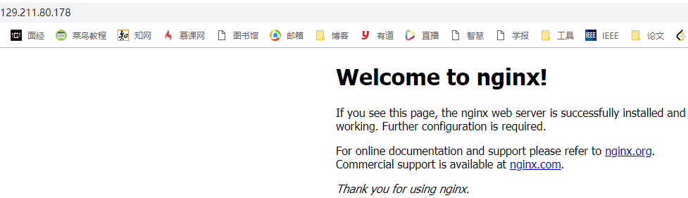 9、在浏览器中访问该nginx所在ip地址,即可以看到nginx默认页面,默认展示的是html目录下的index.html