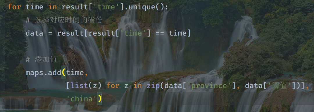 既然以时间为切换指标,那通过循环每一次选择对应时间的所有省份并把每一个时间所有省份对应的值添加: