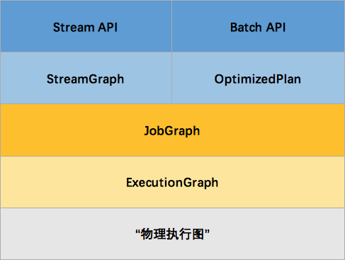 通过Stream API开发的Flink应用,底层首先转换为StreamGraph,然后再转换为JobGraph,接着转换为ExecutionGraph,最后生成“物理执行图”。