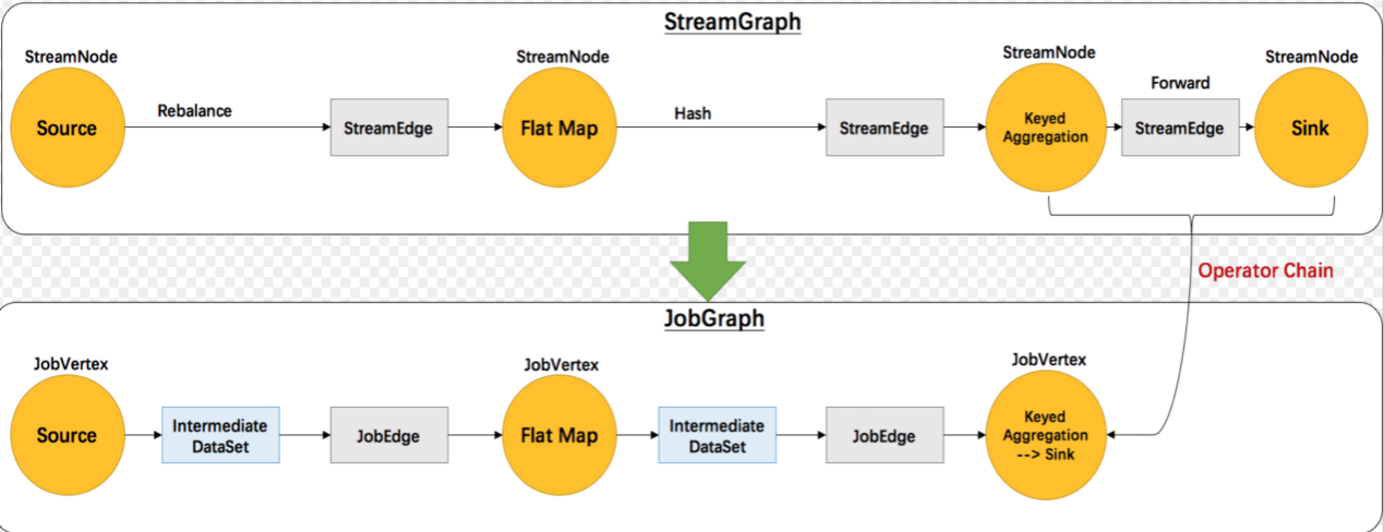 从StreamGraph到JobGraph转换过程中,内部角色也会进行转换
