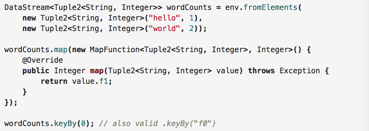 Tuple是包含固定数量各种类型字段的复合类。Flink Java API提供了Tuple1-Tuple25。Tuple的字段可以是Flink的任意类型,甚至嵌套Tuple。
