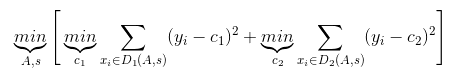 对于任意划分特征A,对应的任意划分点s两边划分成的数据集D1和D2,求出使D1和D2各自集合的均方差最小,同时D1和D2的均方差之和最小所对应的特征和特征值划分点。其中,c1为D1数据集的样本输出均值,c2为D2数据集的样本输出均值。
