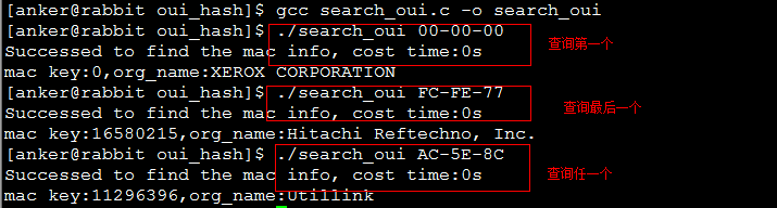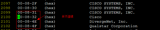 刚开始拿到oui.txt文件时,看了文件的格式和规律。当时没有检查,以为mac前缀是连续的,如是开始第一个想到用hash做,mac前缀作为key,value是mac-key在文件中的偏移量。因为hash是唯一的,转换为整数,不会有冲突。实现后发现生产的mac_org.log文件1.2G之大,文件中有很多空白地方,排查发现mac前缀并不是连续的,而且MAC前缀还存在重复。如下图所示: