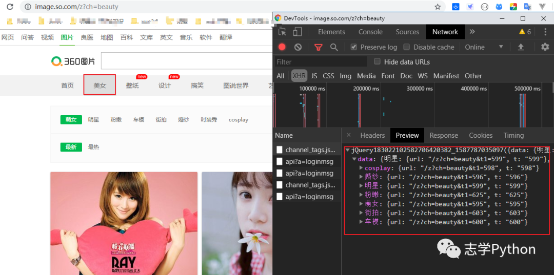创建项目前,我们需要来分析下网站数据,进入 首页,点击美女,我们可以知道跳转到这个页面,可以看出数据是通过 jsonp 的形式,进行 ajax 渲染的,而且每一次刷新页面这个函数都会随机变化,也就是说可能写出来的代码是具有时效性的