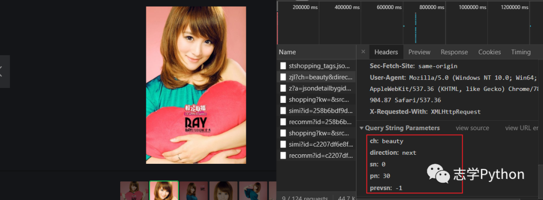 根据我们上面的分析,我们需要一些固定参数,ch,关键字,direction,prevsn,这几个固有参数,当然,我们也可以通过把 ch 动态输入的方式来爬取你需要的图片,这里就只是设置死了,sn 表示起始页数,这个是动态变化的