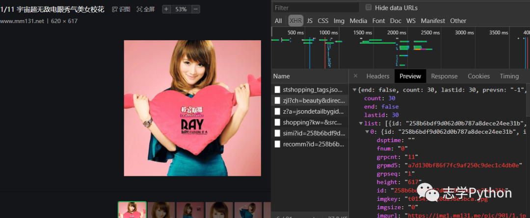 就来到了这个页面,我们 f12 一下,可以看到数据是这样的,具有每张图片的详细信息,点击这个链接,进入 preview