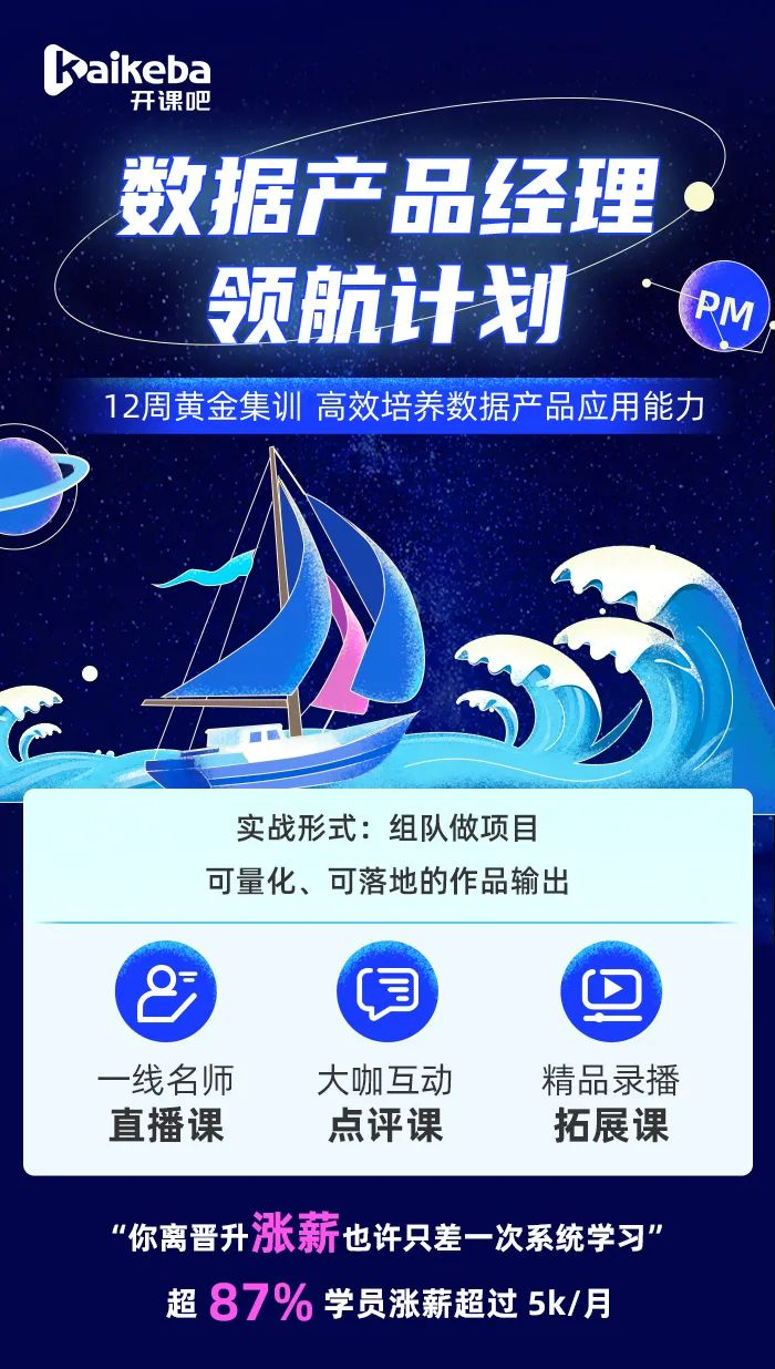 开课吧的这门《数据产品经理领航计划》,不仅专注于提升数据产品经理的核心专业能力,更是面向未来的数据产品进阶指南!不管是面试、入行、还是升职加薪,都会让你非常顺利!