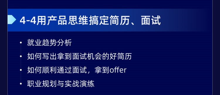 这门课会教你写出拿到面试机会的好简历、面试技巧,以及为你规划清晰的职业目标和方向,让你在数据产品经理的路上不迷茫。