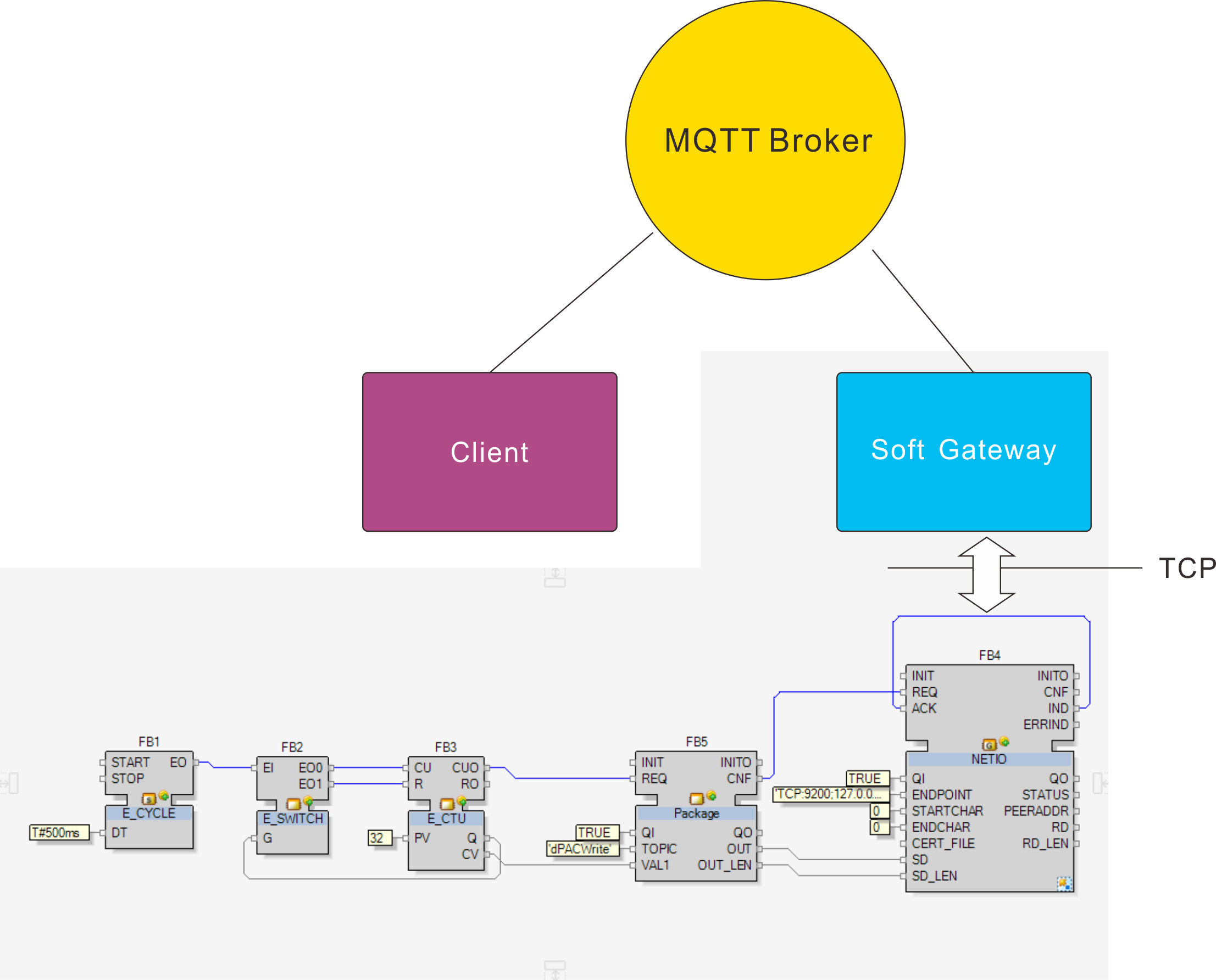 使用已有的NETIO 功能块实现与外部程序的TCP 通信。外部程序(Soft Gateway)将TCP 数据转化成为 MQTT 消息发布。另外一个外部程序(GatewayClient订阅该主题的消息。