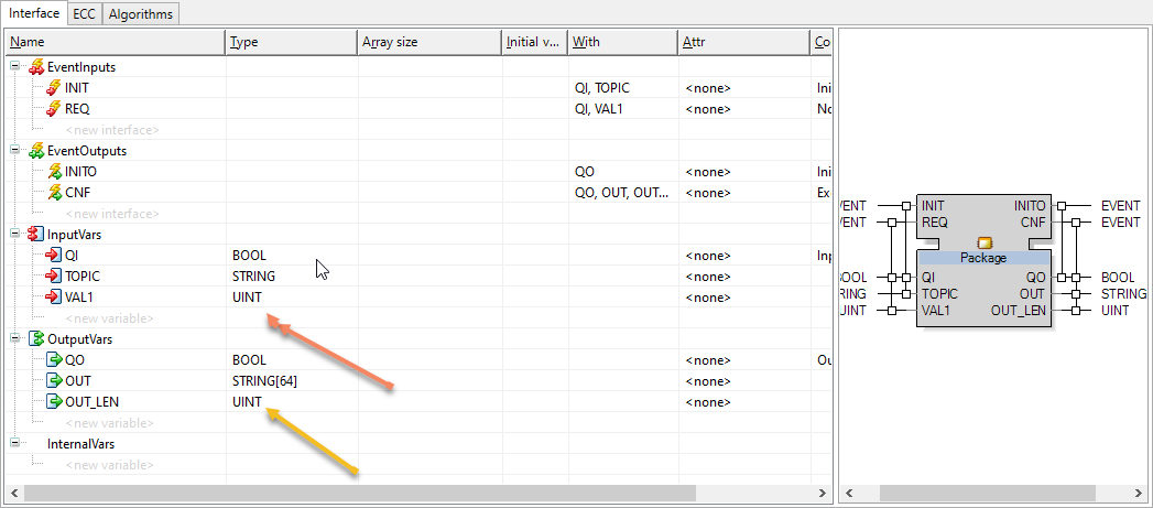 功能块package 是一个IEC61499 基本功能块。实现将MQTT Topic 和counter 数据组成一个TCP 包。由于NETIO 是完成数据的透明TCP 传输。没有定义更高级的数据格式。我们在这里简单地使用IEC61499 标准推荐的ASN.1 数据格式。有关ASN.1 的更多信息可以参阅我的博文-关于IEC61499 的数据交换信息抽象语法ASN.1