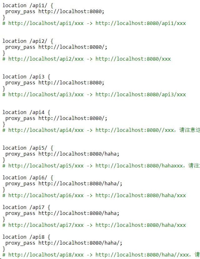 (2)另一种是在端口号之后有其他路径的,包含了只有单个/的,如proxy_pass http://localhost:8080/,以及其他路径,比如proxy_pass http://localhost:8080/abc。