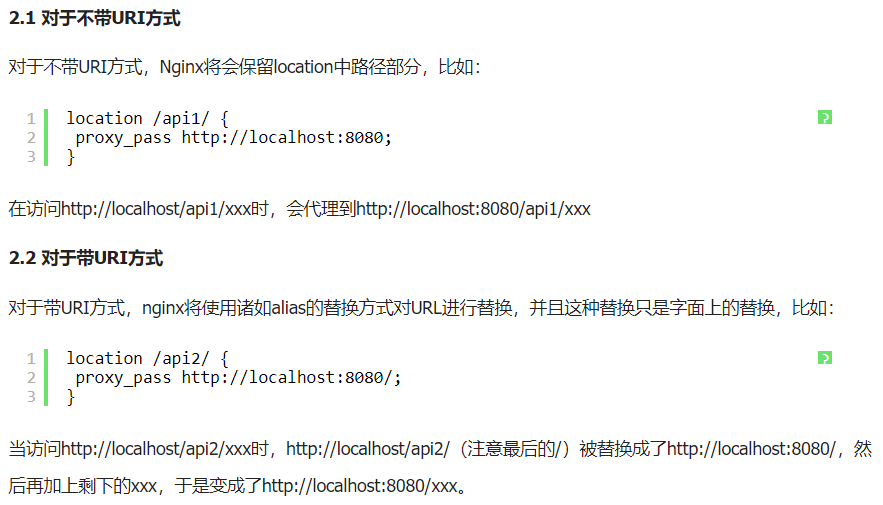 (1)一种是只包含IP和端口号的(连端口之后的/也没有,这里要特别注意),比如proxy_pass http://localhost:8080,这种方式称为不带URI方式;