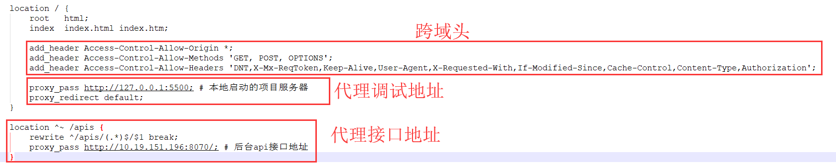 修改nginx.conf文件,加上跨域头,代理调试地址,接口地址。