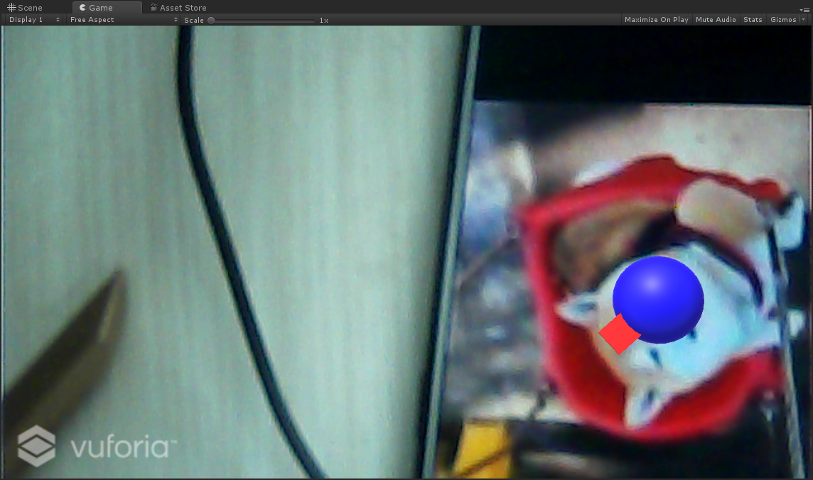 我是在手机上显示图片,运行时将电脑摄像头对准手机上的图片拍摄,在Game窗口会显示摄像头看到的图片上有一个旋转的蓝色球体,这样就成功了.