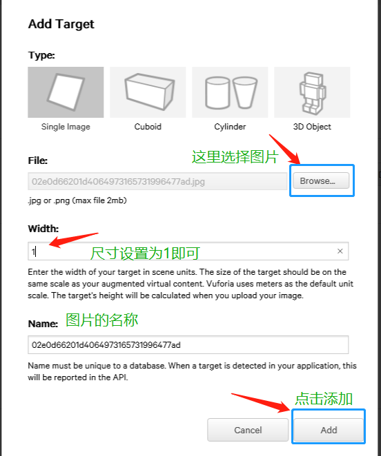 第十步:添加Target(Target为所识别的图片文件,格式为.jpg或者.png),选择一张对比度清晰、识别度高的图片。图片名称必须为英文