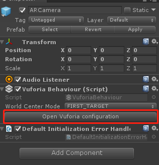第十三步:配置AR相机,点击ARCamera,属性面板中点击下图红色框框中的按钮